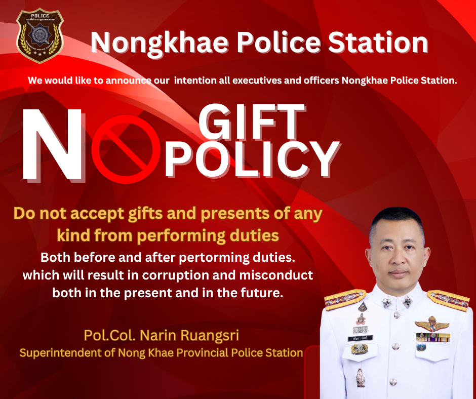 ประกาศนโยบายต่อต้านการรับสินบน (Anti-Bribery Policy) และ ไม่รับของขวัญของกำนัล (No Gift Policy) จากการปฏิบัติหน้าที่ พ.ศ.2568 Announcement of Anti-Bribery and not accepting gifts or any other benefits (No Gift Policy) from performing duties Fiscal of the year 2025 ประกาศนโยบายไม่รับของขวัญของกำนัล (No Gift Policy) จากการปฏิบัติหน้าที่ พ.ศ.2568 Announcement of not accepting gifts or any other benefits (No Gift Policy) from performing duties Fiscal of the year 2025 สถานีตำรวจภูธรหนองแค ประชาสัมพันธ์กิจกรรมต่างๆ กิจกรรมเนื่องในวันนวมินทรมหาราช 13 ตุลาคม 2568 ในวันจันทร์ที่ 13 ตุลาคม 2568 กิจกรรมในพิธี ข่าวประชาสัมพันธ์ กิจกรรมต่างๆ วันที่ ๑๓ ตุลาคม ๒๕๖๘(เวลา ๐๗.๐๐ น.)ภายใต้การอำนวยการของพ.ต.อ.เกษดา วัชรานนท์รอง... Read More 5 ธันวาคม 2568 กิจกรรมเนื่องในวันคล้ายวันพระราชสมภพพระบาทสมเด็จพระบรมชนกาธิเบศร มหาภูมิพลอดุลยเดชมหาราช บรมนาถบพิตร วันชาติ และวันพ่อแห่งชาติ ข่าวประชาสัมพันธ์ กิจกรรมต่างๆ วันที่ 5 ธันวาคม 2568(เวลา 07.00 น.)ภายใต้การอำนวยการของพ.ต.อ.นรินทร์... Read More