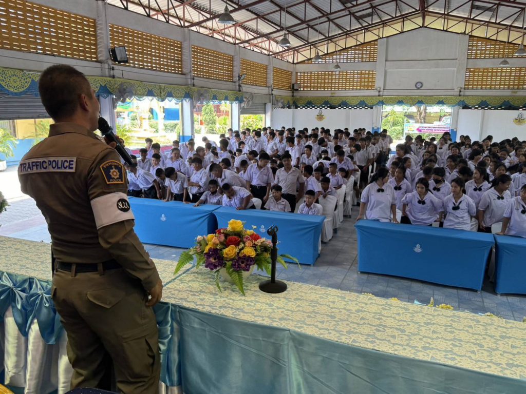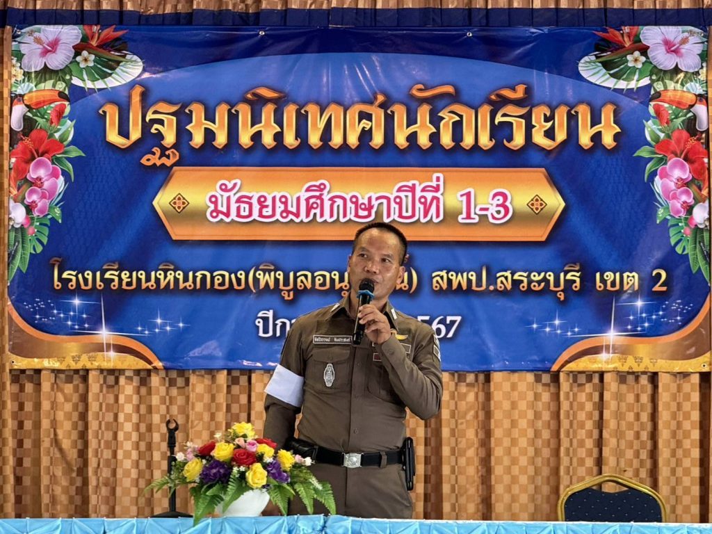พ.ต.ท.ประสาร ธนะทรัพย์ทอง สวป.สภ.หนองแค , ร.ต.อ.กิจวิวรรธ อินประสงค์ รอง สว.จร.สภ.หนองแค พร้อมเจ้าหน้าที่จราจร สภ.หนองแค ให้การอบรมบรรยายกฏหมายจราจร แก่นักเรียนโรงเรียนหินกอง(พิบูลอนุสรณ์)